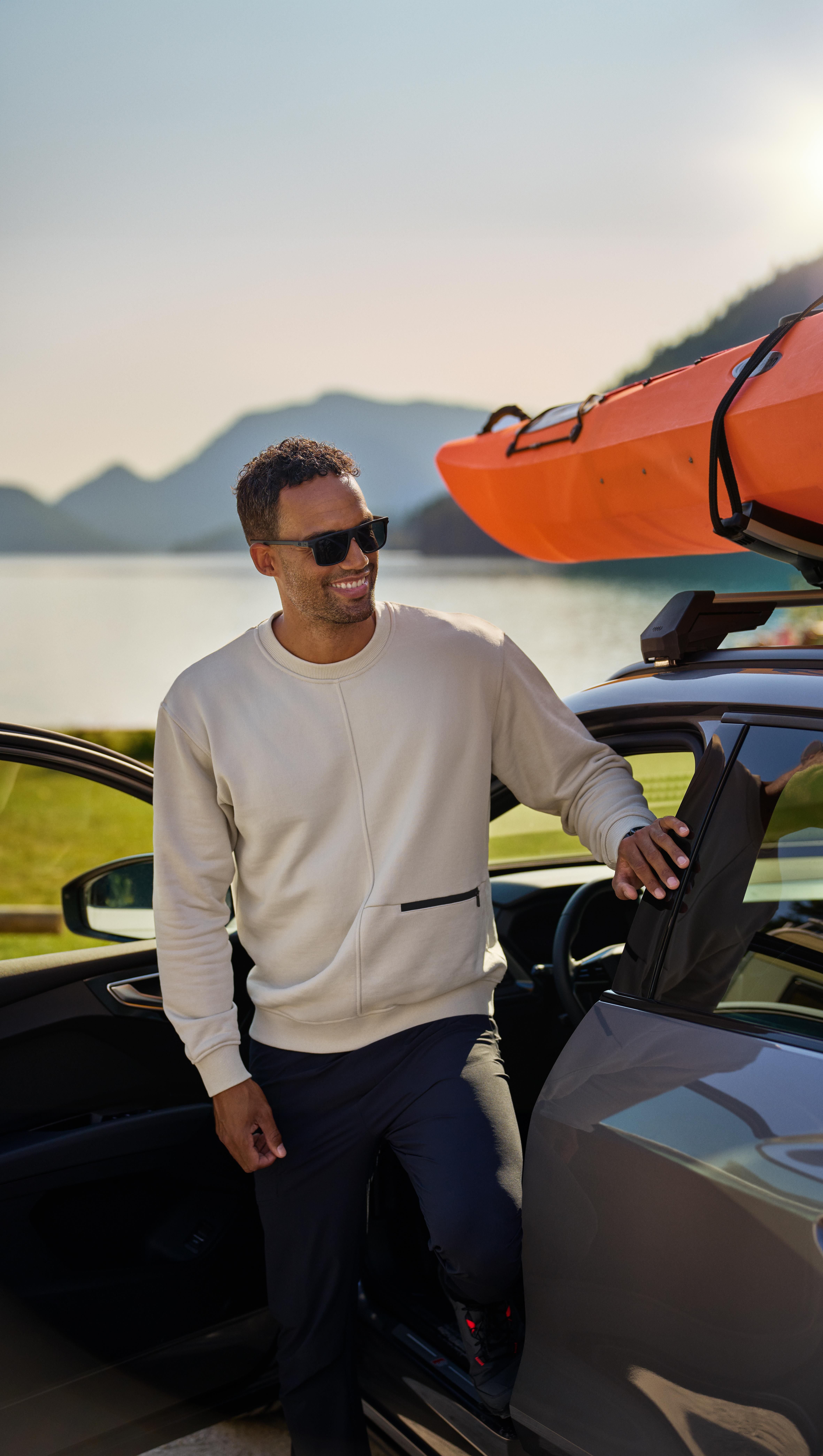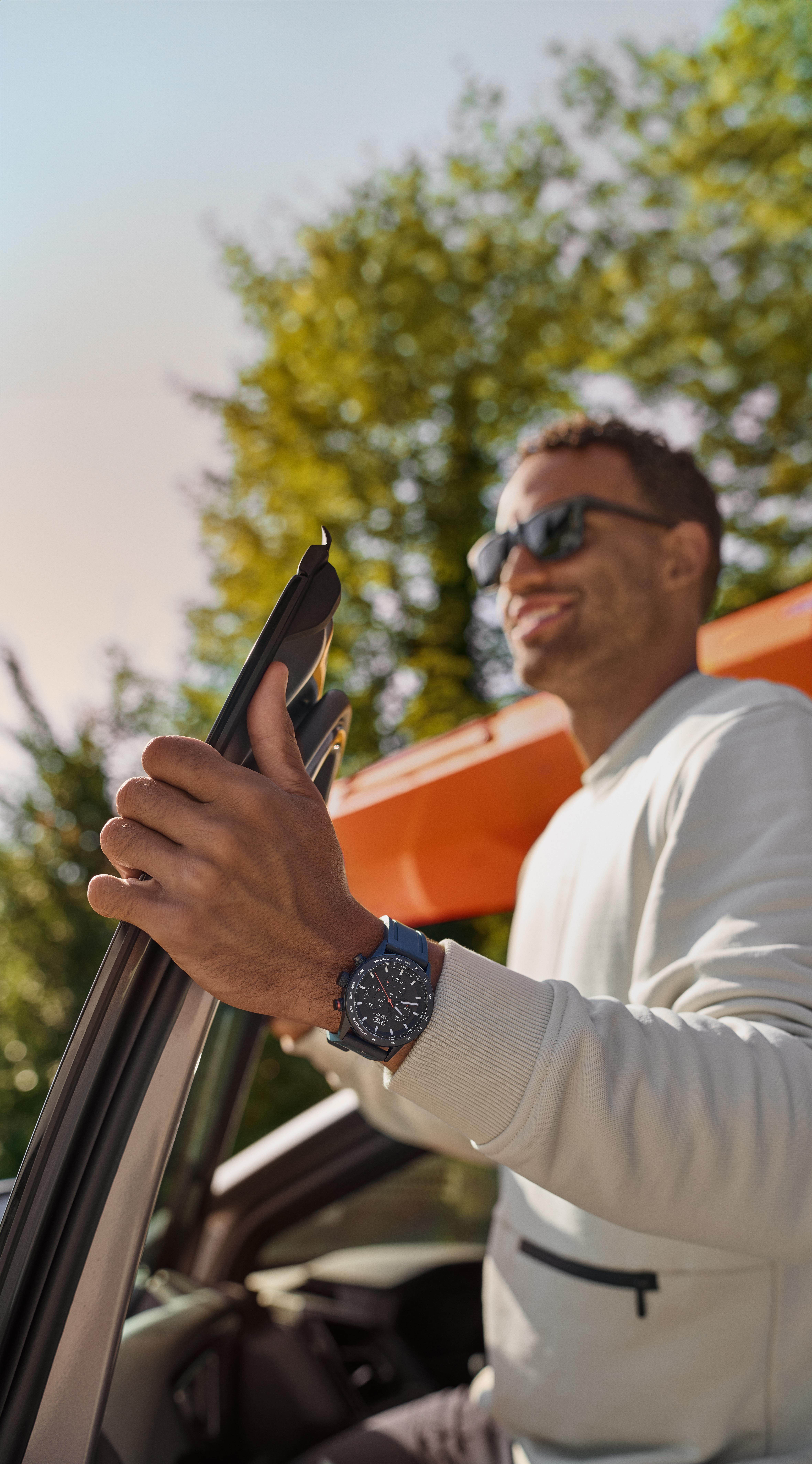 Complement your look with these modern Audi sunglasses: the frame made of bio-based material offers lightness and flexibility – perfect for sports and day-to-day use.