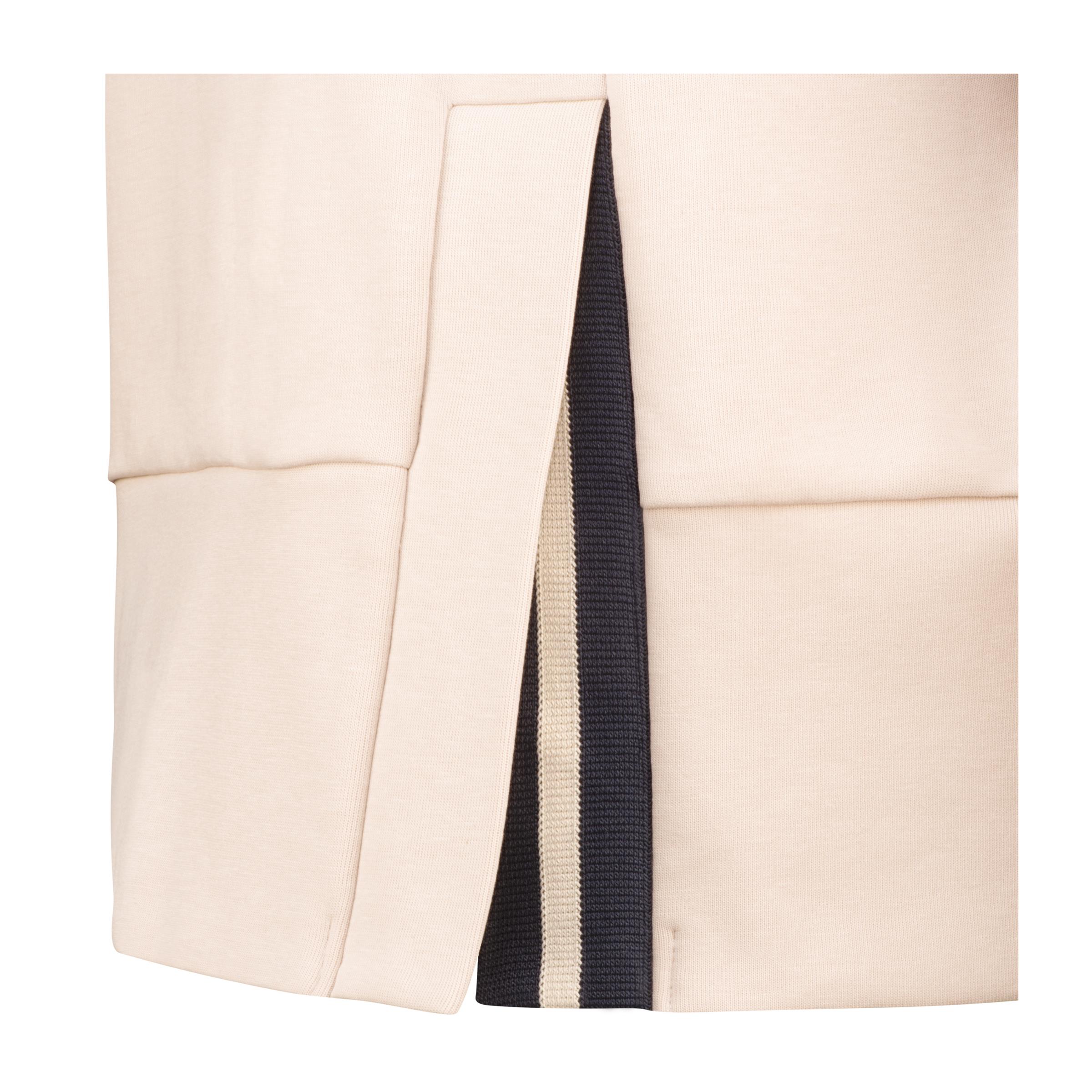 - Dividing seam in the front and decorative slit at the hem with striped ribbon at underlay