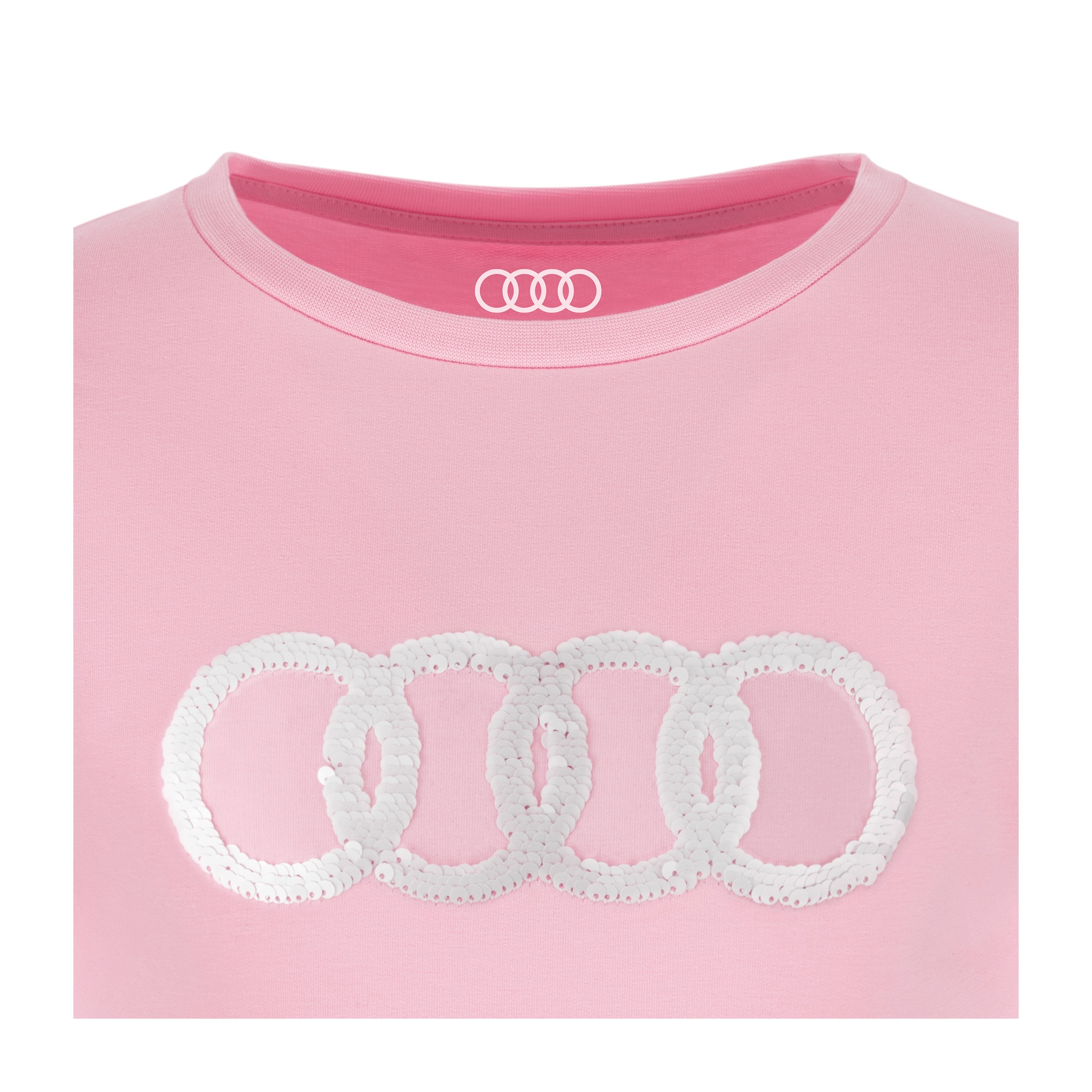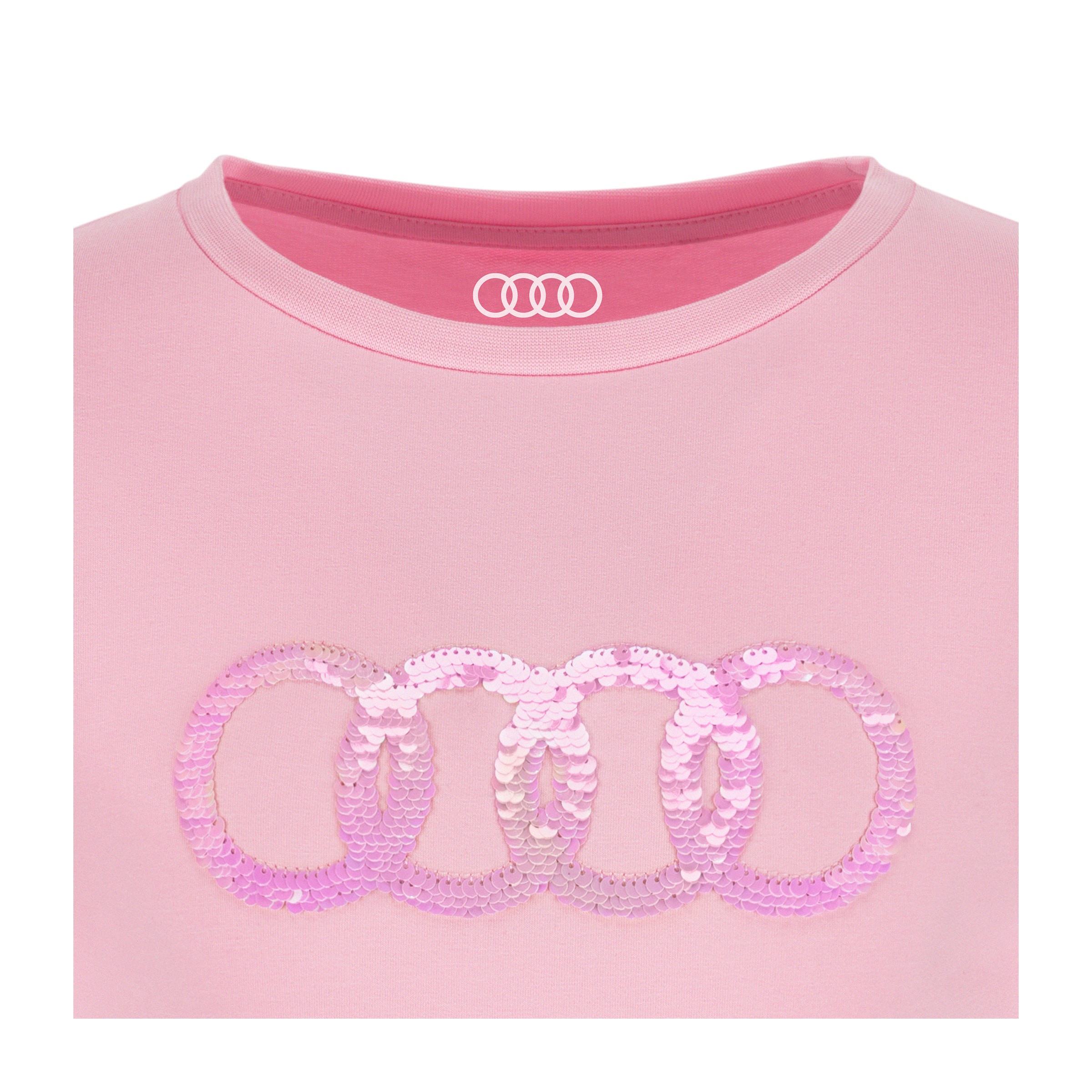 - Große Audi Ringe auf der Brust aus Wendepailletten; irisierend von pink nach weiß