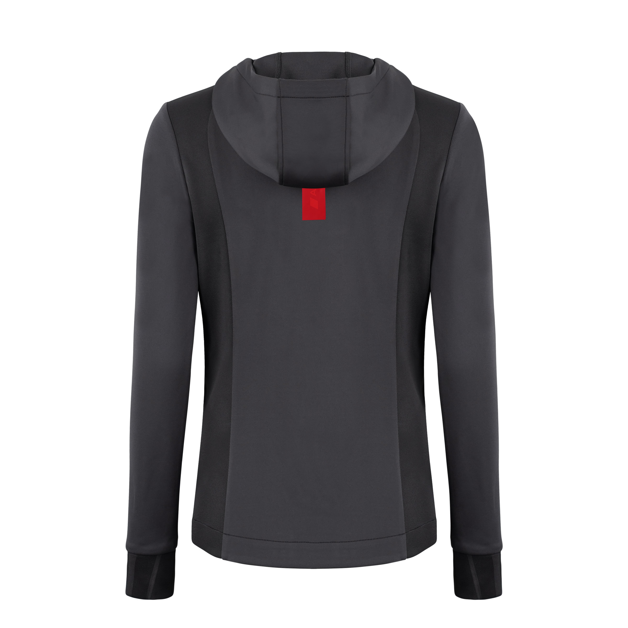 - Modischer zweiter Reißverschluss bis Brusthöhe zur Erweiterung des Ausschnitts mit rotem Stoffeinsatz