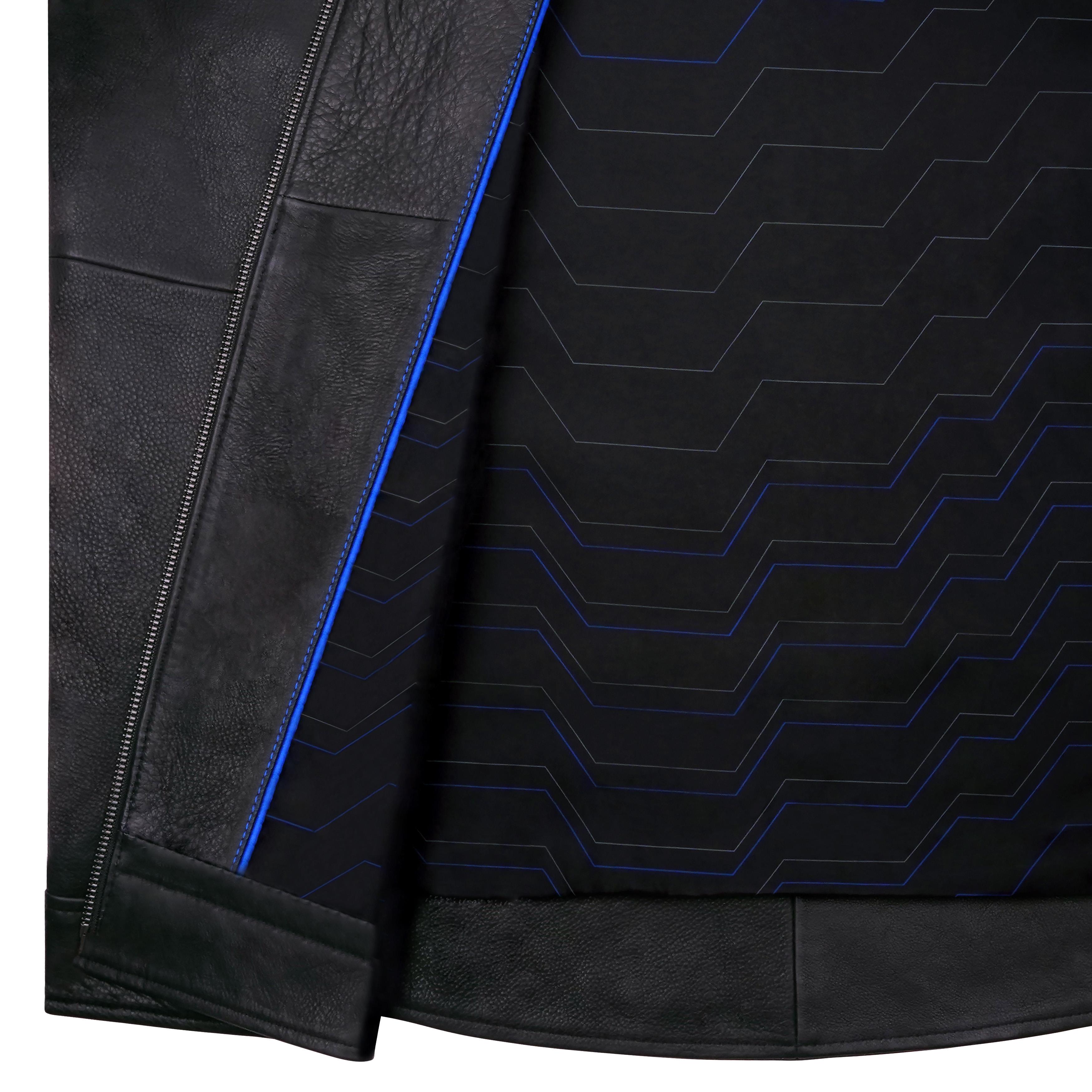 - Dezente blaue Akzente an Kontrastnähten innen